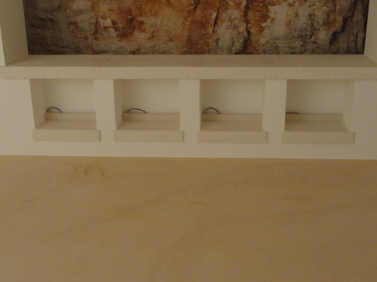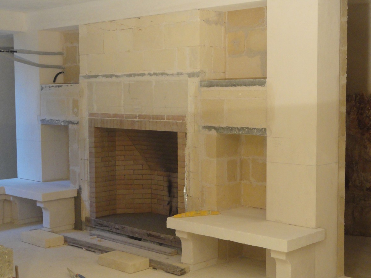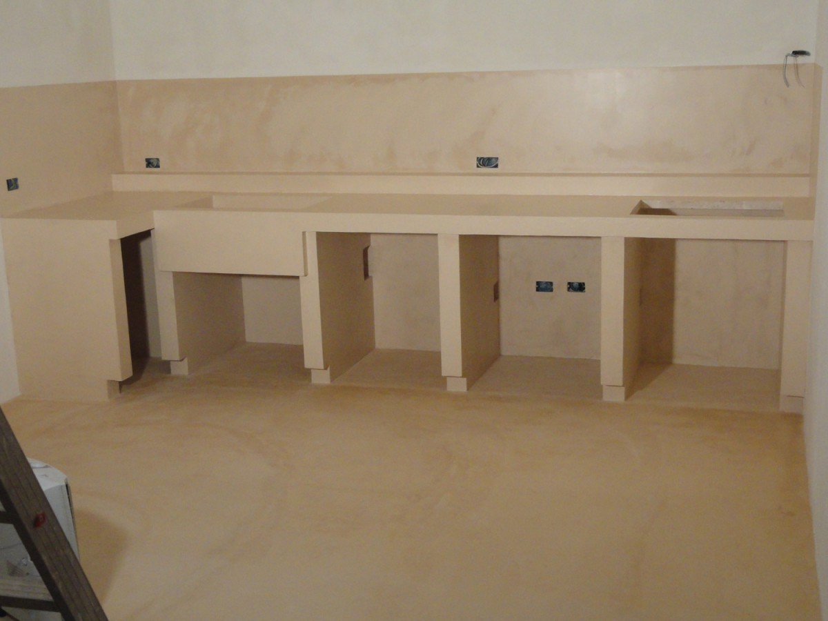 Completamento tavernetta villa a Martina Franca con finiture cemento colorato, resina e pietra. Realizzazione camino e cucina.